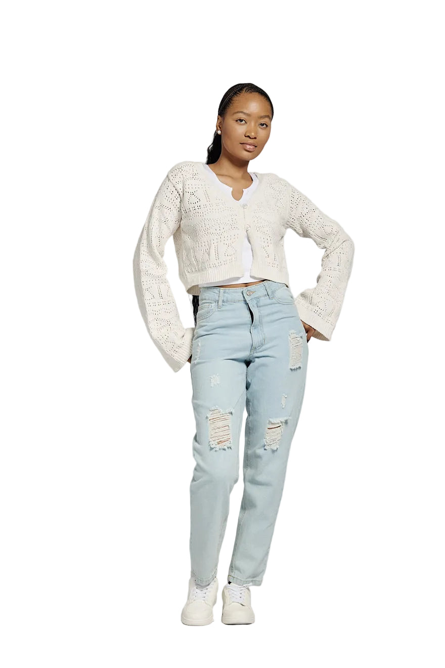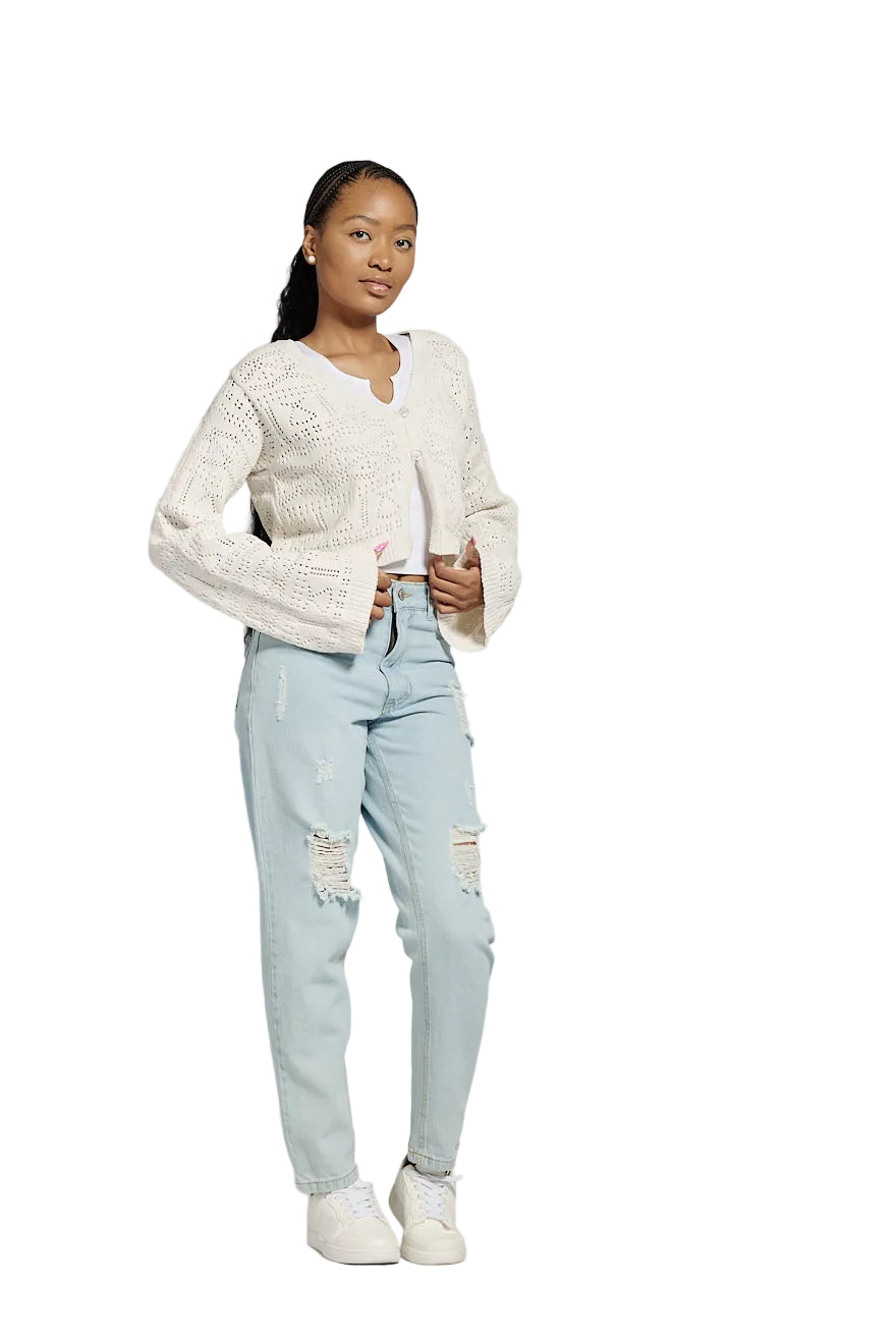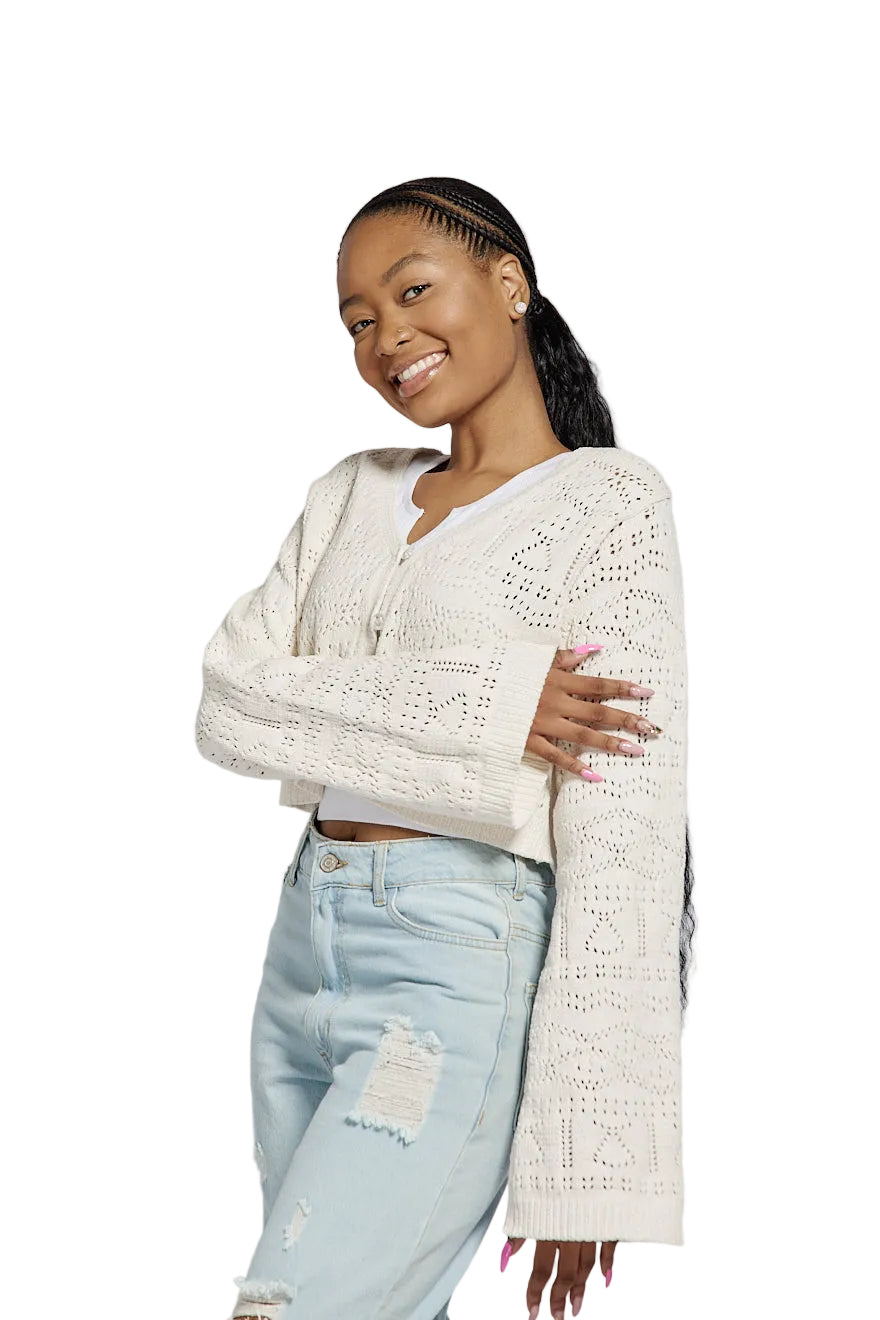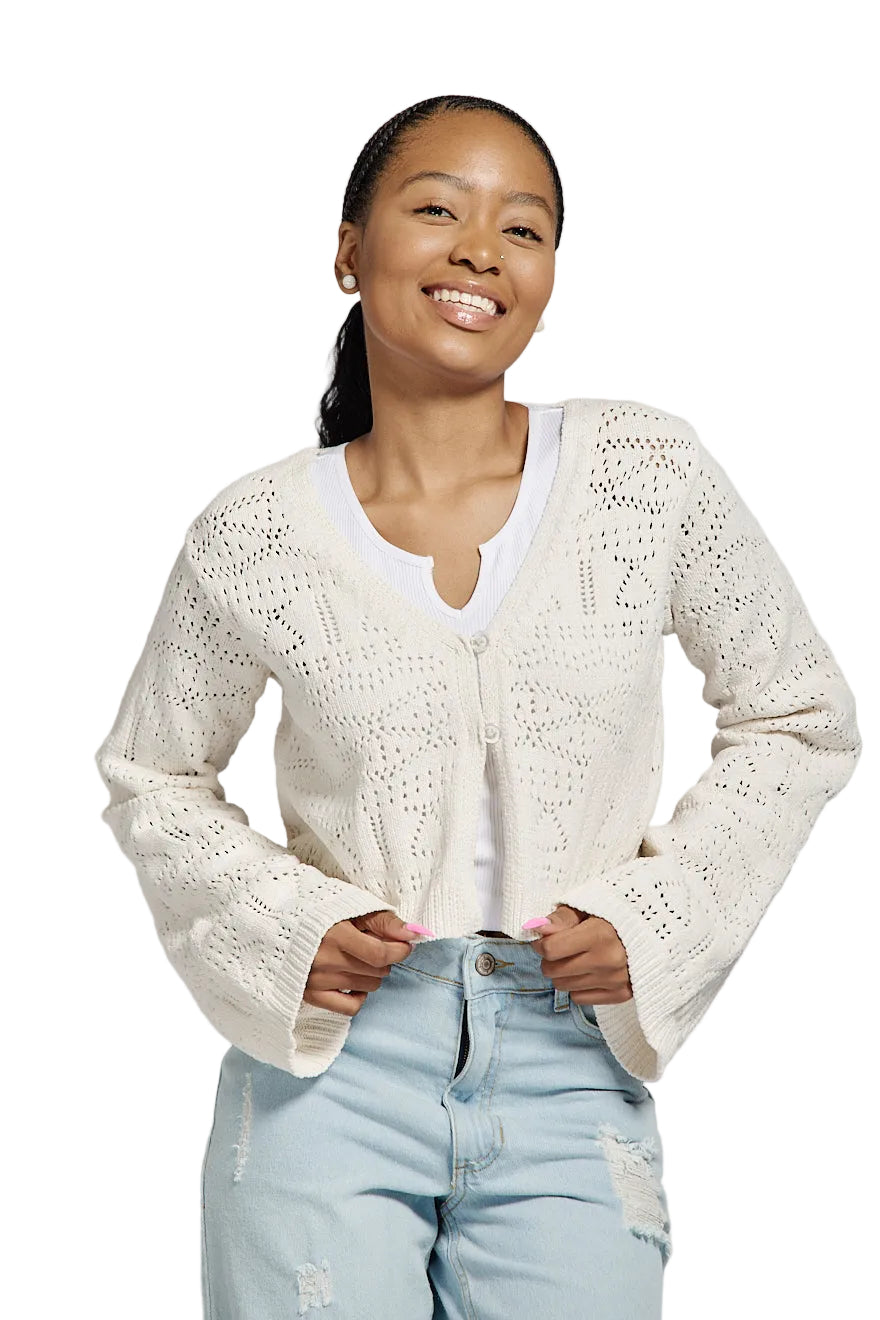 LADIES L/S CREAM CROCHET CARDIGAN
